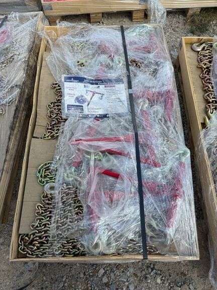 Unused 5400 LB Ratchet Binders & G70 Chains (Total QTY of 24) Specification:5400 LBS Ratchet Type Load Binders (QTY of 8) & 5/16" G70 Transport Chains (QTY of 16) •5400 LB Ratchet Binders: Uaage: For Cargo, Suitable for Chains Load Binder Size((in): 5/16"-3/8" Technology: Forged Handle and Hook, Welded Chain •G70 CHAINS Function: Transmission Chain Surface: Colorful Zinc Usage: Cargo Control, Hoisting, Lifting, 40 (kgs), (mm)