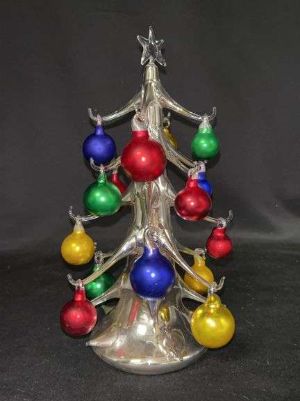 LOT 72 - Adorable Dept. 56 chrome Christmas tree with multi-colored glass ornaments…..9-1/2” tall