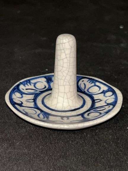 LOT 93 - Vintage Dedham Potting Shed Rabbit Pattern Blue/White Pottery Ring Holder
