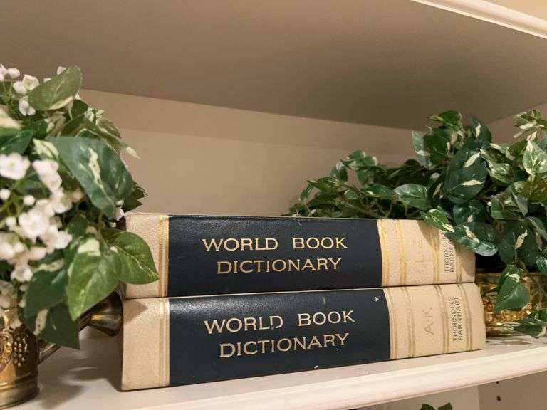 2 Thornedike Barnhart Dictionaries and 2 brass plants home decor