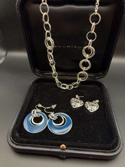 Hammered silver necklace at 21.17g. Silver heart earrings at 2.05g each. Silver drop hoop chiseled earrings at 5.68g