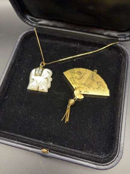 14k 18” chain 1.07g. 14k MOP Elephant pendant 1” / 5.30g. GP two-sided Asian etched fan w/tassle 2”
