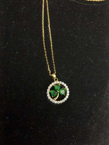LOT 155 - 3/4” Gold Shamrock with Green and White Crystals Pendant Necklace