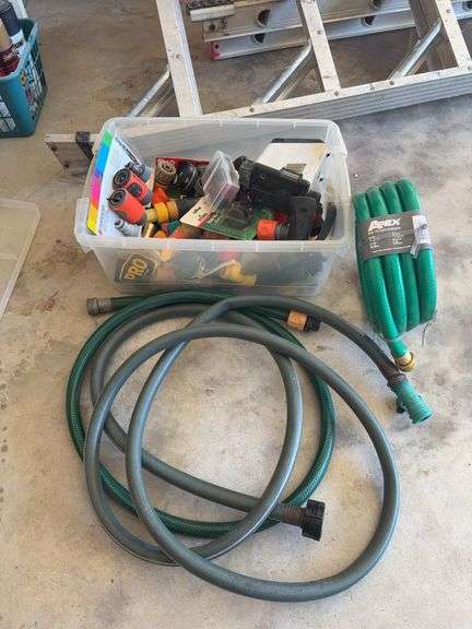 One 10inch hose, 10ft hose, and a 15ft hose. A box of hose extenders, sprinkler heads, and nozzles.
