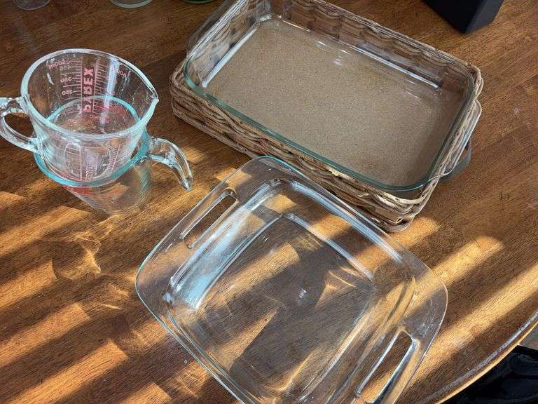 Made for Pyrex carrier. Two glass measuring cups, a deep 8x8 and 9x12 casserole dish