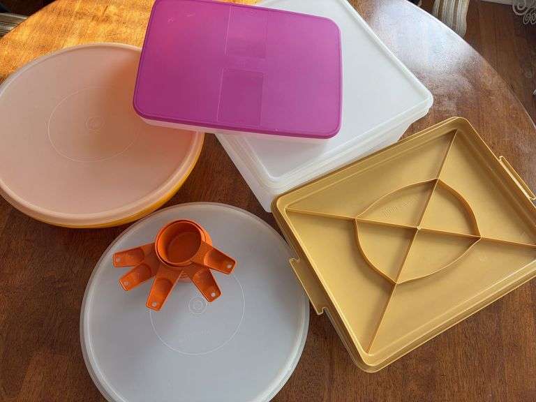 5 Storage w/lids 12” - 15”. A set of Tupperware measuring cups