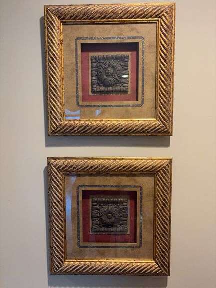 LOT 323 - Pair of Framed Art with Metal Medallions and Red Matte in Shadow Box