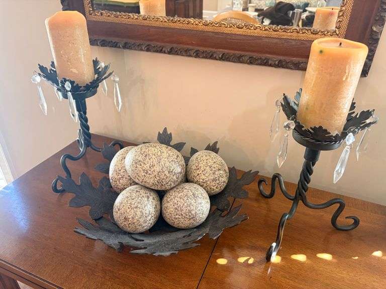 LOT 327 - Wrought Iron Candle Holders and Matching Leaf Bowl with Egg Decor