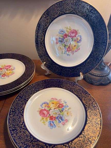 Five 11” vintage Homer Laughlin dinner plate featuring a cobalt blue rim with 22k gold gilt detailing and a floral bouquet in the center.