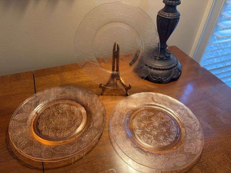 LOT 401 - Macbeth-Evans Dogwood Pink Depression Glass Plates and a Pair of Matching Glass Flutes