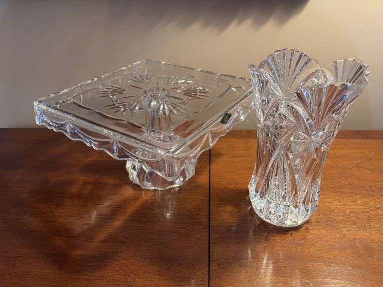 DescriptionShannon 10" Square Pedestal Cake Plate. Scallop design, hand-cut 24% lead crystal. 8 3/4” Vase