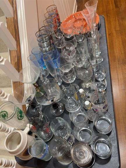 LOT 439 - HUGE 60+ ASSORTMENT of Gold Rim Liberty Bowl Glasses, Notre Dame Mugs, Dupont Glasses, Tumblers, Martini and More!
