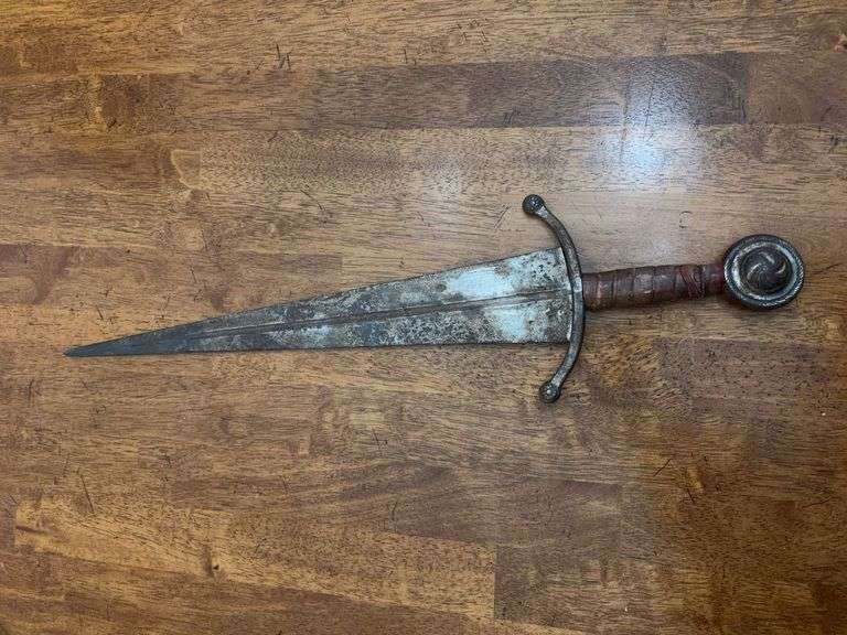 An Italian Cinqueda Short Sword, likely 19th c., the 18.25" triangular double edge blade with 11.75" fuller at both sides, the guard curving outward terminates in rosette decoration, the handle made of hardwood, a circular pommel with a rosette swirl design, the sword 24.5"l, housed in a steel and leather sheath, overall with sheath 25.5"l, 2.40lbs