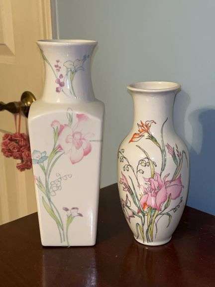 LOT 121UPa - Pair of beautiful oriental influenced ceramic vases…..left is 10-1/4 tall and right is 8” tall…..both are Made in Japan