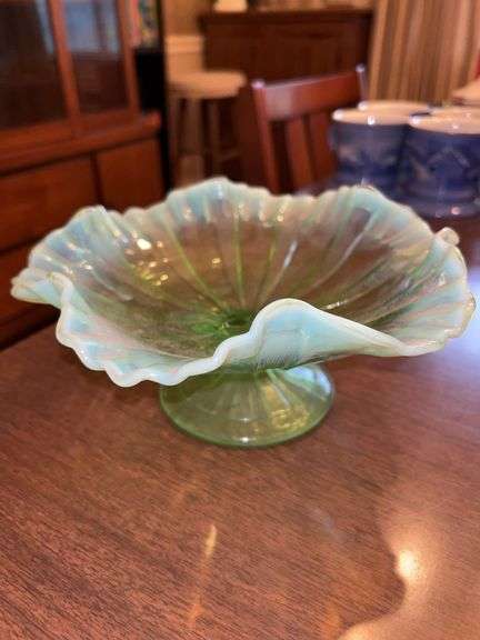 LOT 193LR - Vintage green opalescent Jefferson glass pedestal bowl…..8-3/4D x 4” tall
