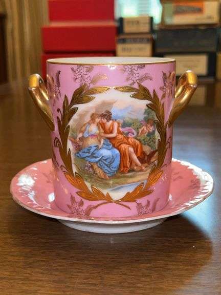 LOT 209LR - Victoria Carlsbad Porcelain Jar and Saucer….research indicates it was used to hold jelly/jam jars or milk cans, as it was not common to just set jars/cans out on the table
