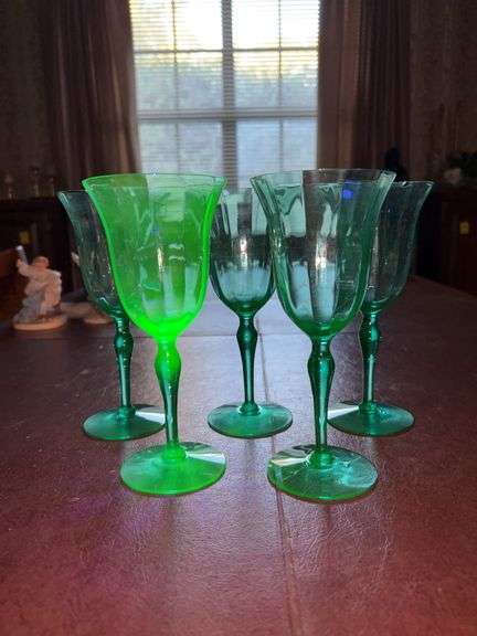 LOT 239KIT - Set of (5) Uranium Paneled Glass Wine glasses…..minor chipping on rim and stands 7-1/2” tall