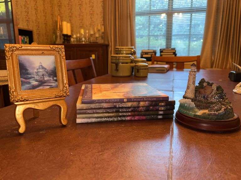 LOT 248KIT - Grouping of Thomas Kinkade home decor and books…..easel and framed print stand 6” tall…..lighthouse lights up