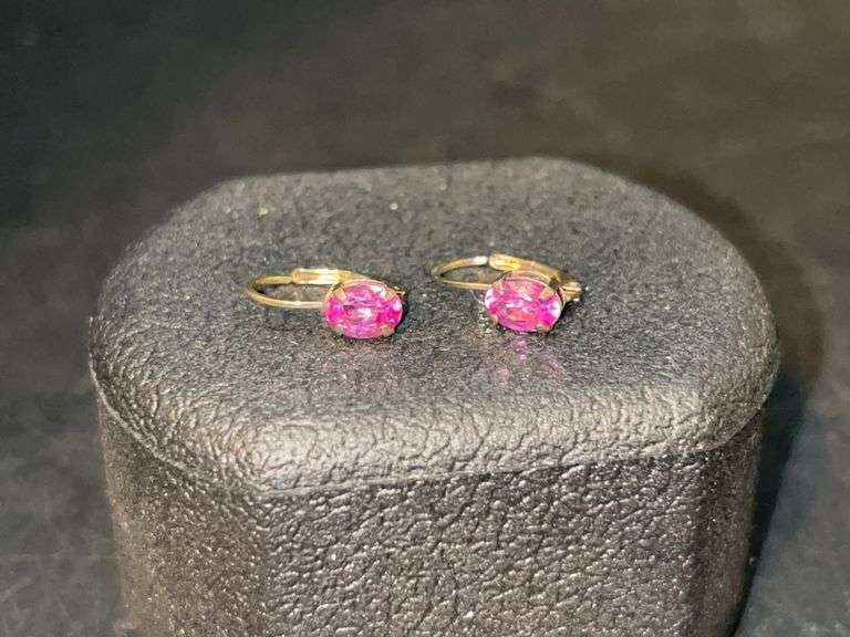 LOT 405J - Pair of lever-back gold tone over sterling earrings with fuchsia colored stones